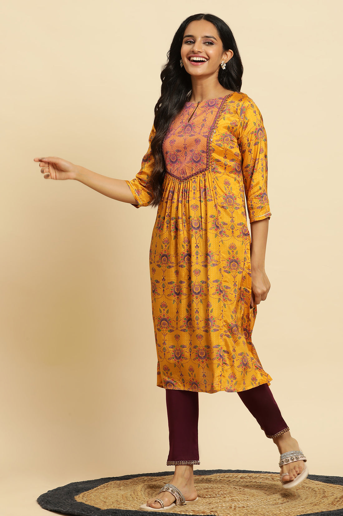 Crafted with chunky thread work and metallic sequins, the kurta has a textured yoke with stitch detailing. The simple straight silhouette has a colourful print inspired from suzani motif.