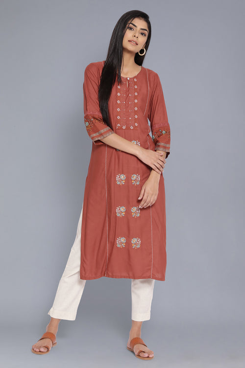 Baked clay orange straight kurta in keyhole neckline with three-quarter sleeves and embroidery on yoke. The kurta is paired with matching flared pants in mid-rise and partially elasticated waistband.