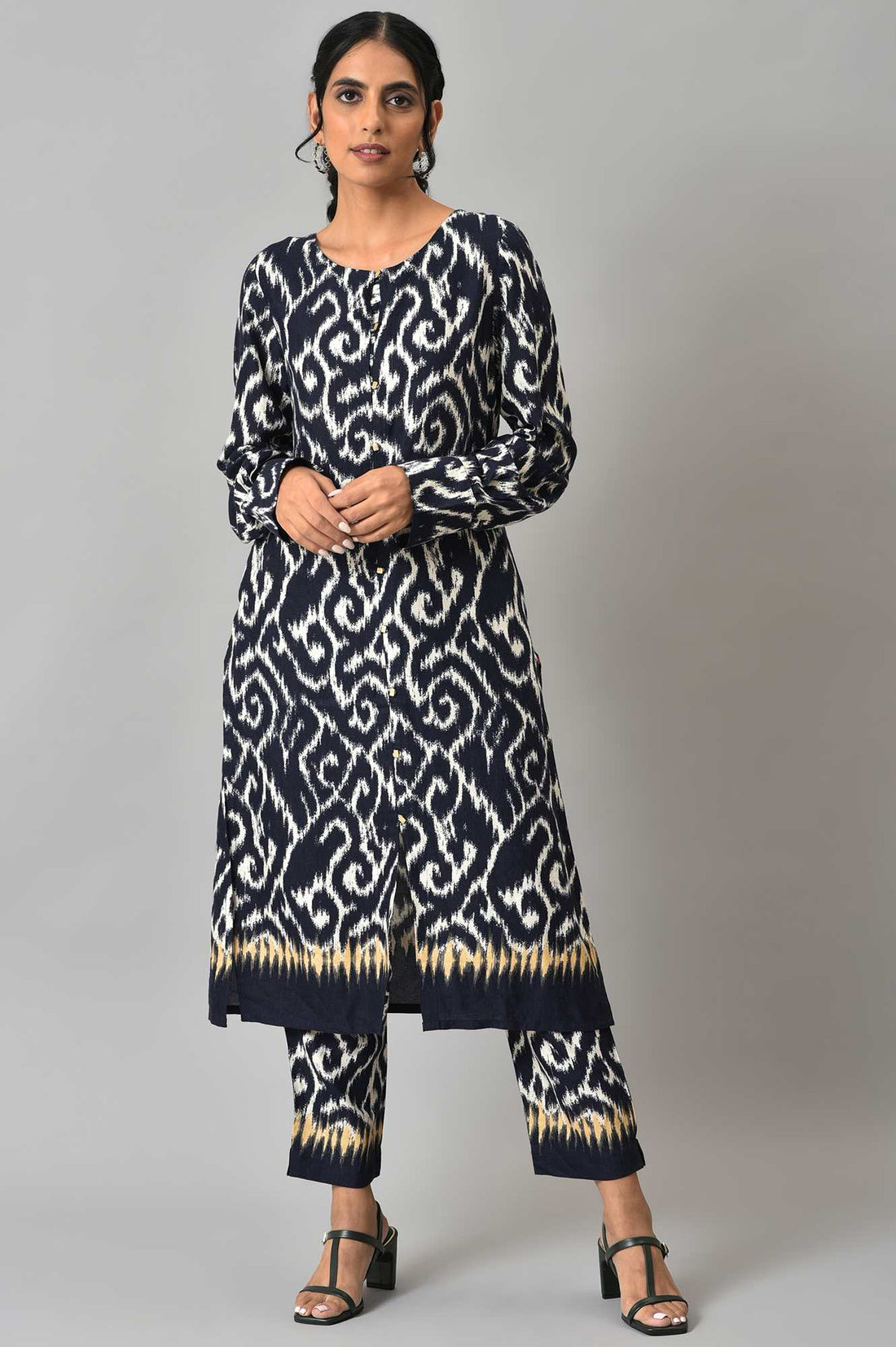 Blue Ikkat Printed kurta With Ruched Sleeves And Statement Button Detail. It Is Paired With Blue Ikkat Printed Ankle Length Slim Pants.