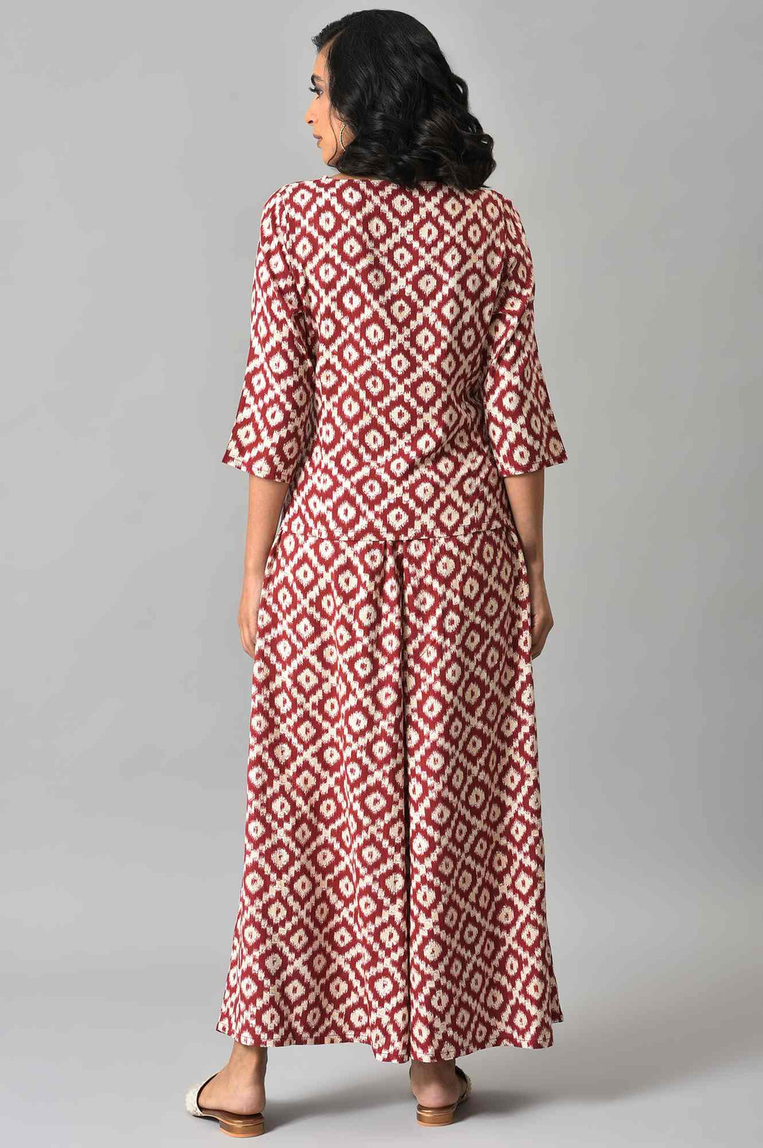 Ikkat Printed Top With Front Waist Tie-Up And Notched Hem. It Is Paired With Ikkat Printed Flared Pants.
