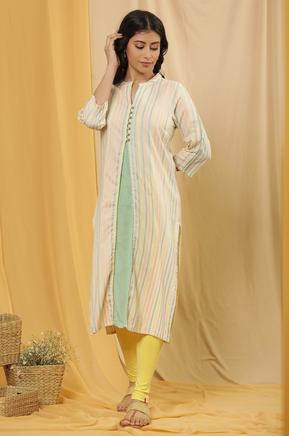 For Your Casual Look This Mock Layer Kurta Set Is A Great Pick. The Kurta Has Collared V-Neck And Stripe Print. It Is Paired With Yellow Tights.