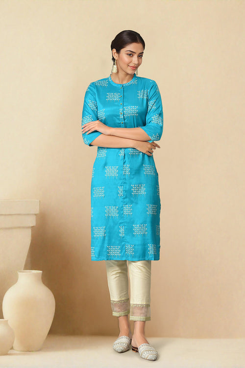 Elegant And Stylis, This Turquoise Blue kurta Is A Perfect Pick For Evening Getaway. It Has Mandarin Collar And Floral Print.