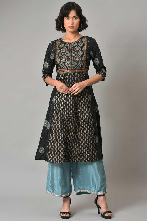 Get Ready For The Night Occasion In This Elegant Black Panelled kurta. The kurta Has Foil Print On It And Keyhole Neckline. It Is Paired With Blue Parallel Pants Having Border On Hemline.