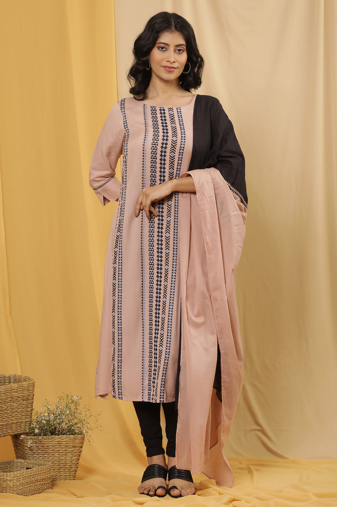 This Dusky Pink Kurta Set Is A Must-Have For Your Summer Wardrobe. The Set Has Straight Kurta With Black Geometric Print And It Is Paired With Tights And Colour Block Dupatta.
