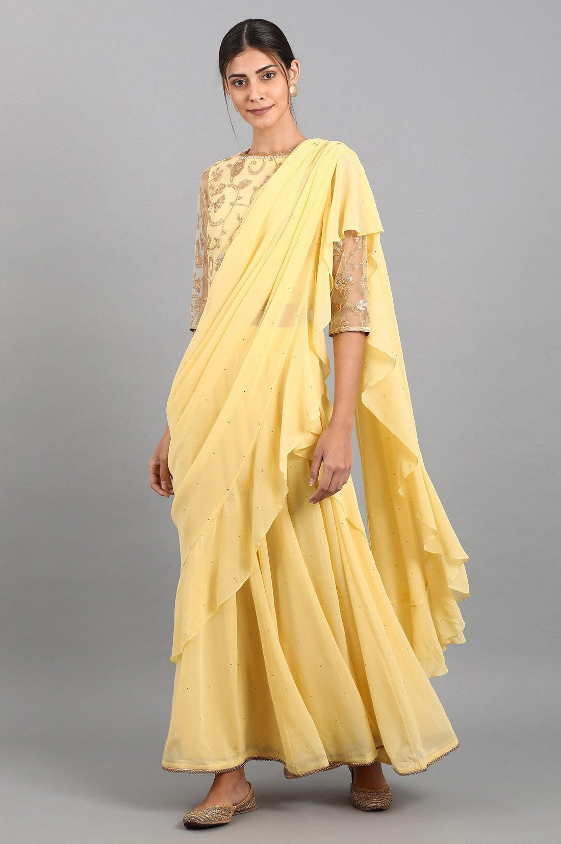 This set has a yellow round neck embroidered crop top and georgette skirt with attached ruffle drape.