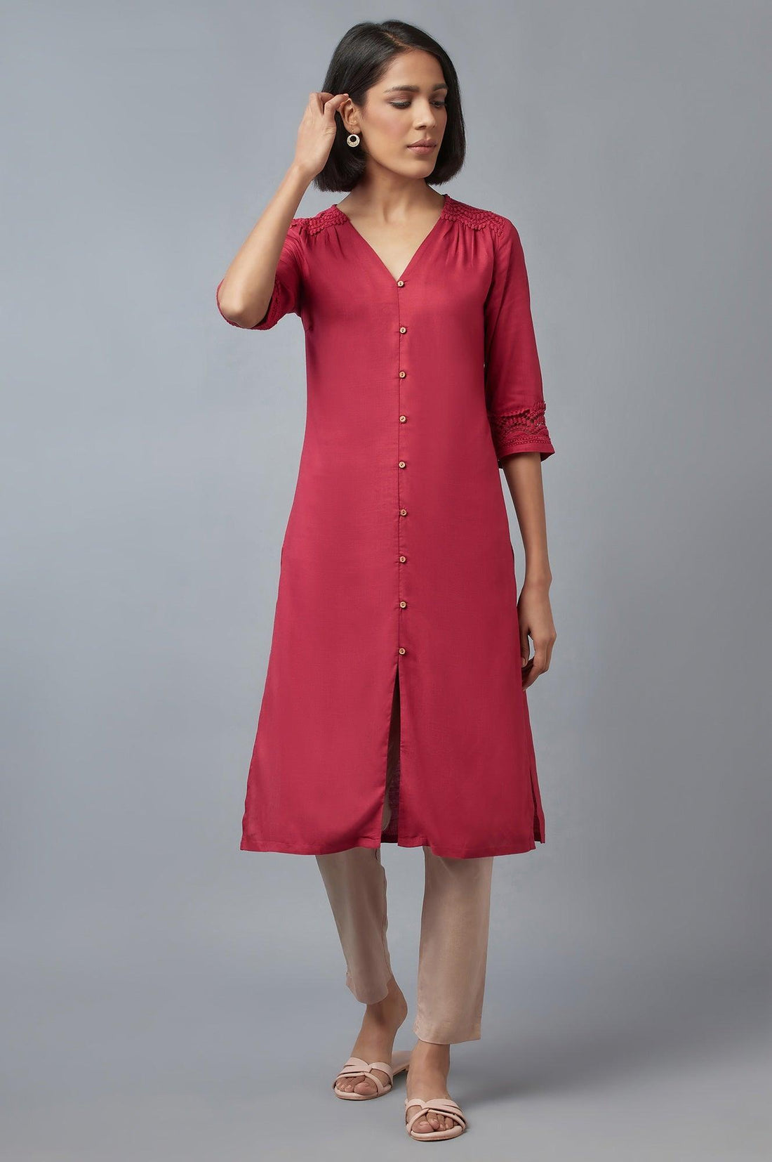 Step out in a bright summer morning in this statement making deep red solid button down kurta. Crafted in premium fabric, the kurta has lace insert and V-neck with button closure