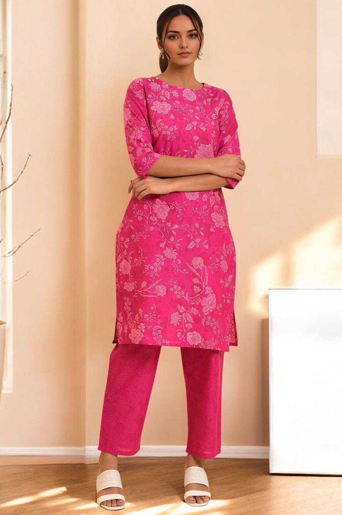 This pink floral printed co-ord set brings together a pure cotton kurta and matching pants for effortless ethnic style. The kurta features a boat neckline and relaxed fit, complemented by the printed pants in a coordinated floral motif. Crafted for comfort and all-day wear, this kurta set for women is ideal for hot summer days, casual poojas, or weekend get-togethers. The breathable cotton fabric keeps you cool while the pastel floral print adds a soft charm. Wear it as a set or style separately with solid dupattas or contrast bottoms. Part of W’s summer-ready cotton edit, this ensemble is perfect for those who prefer simplicity with feminine flair.