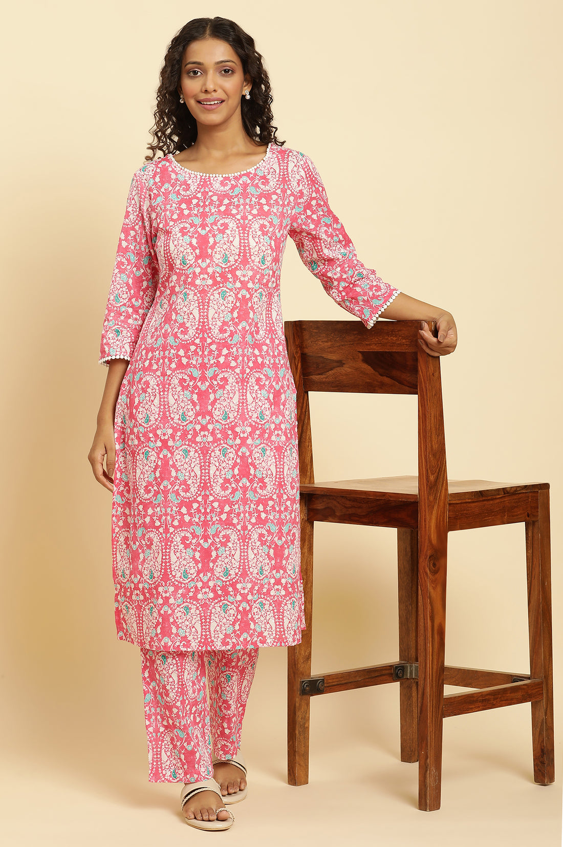Get Ready To Make Impact Wherever You Go With This Statement Pink Coloured Co-Ord Set. The Set Has Straight Kurta In Boat Neck With Lace Detailing. It Is Designed In Straight Silhouette And Has Lace Work On Sleeves As Well. It Is Co-Ordinated With Matching Straight Pants. This Elegant Set Is Embellished With Beautiful Soft Multi-Coloured Floral Prints.