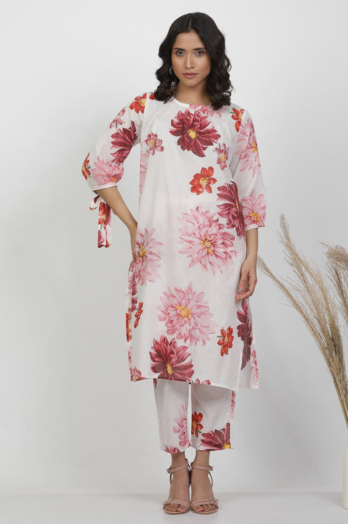 Discover the perfect blend of comfort and style with this women's ethnic set. Crafted from 100% pure cotton, this woven ensemble features a kurta and straight pant combination ideal for casual occasions. The kurta boasts a charming keyhole neckline and three-quarter sleeves, adding a touch of elegance to the overall design. The white fabric is adorned with a delightful floral print, creating a fresh and feminine look. The straight silhouette of both the kurta and pants ensures a flattering fit for various body types. This versatile set effortlessly combines traditional ethnic elements with contemporary fashion, making it a must-have addition to your wardrobe for any casual outing or relaxed gathering.