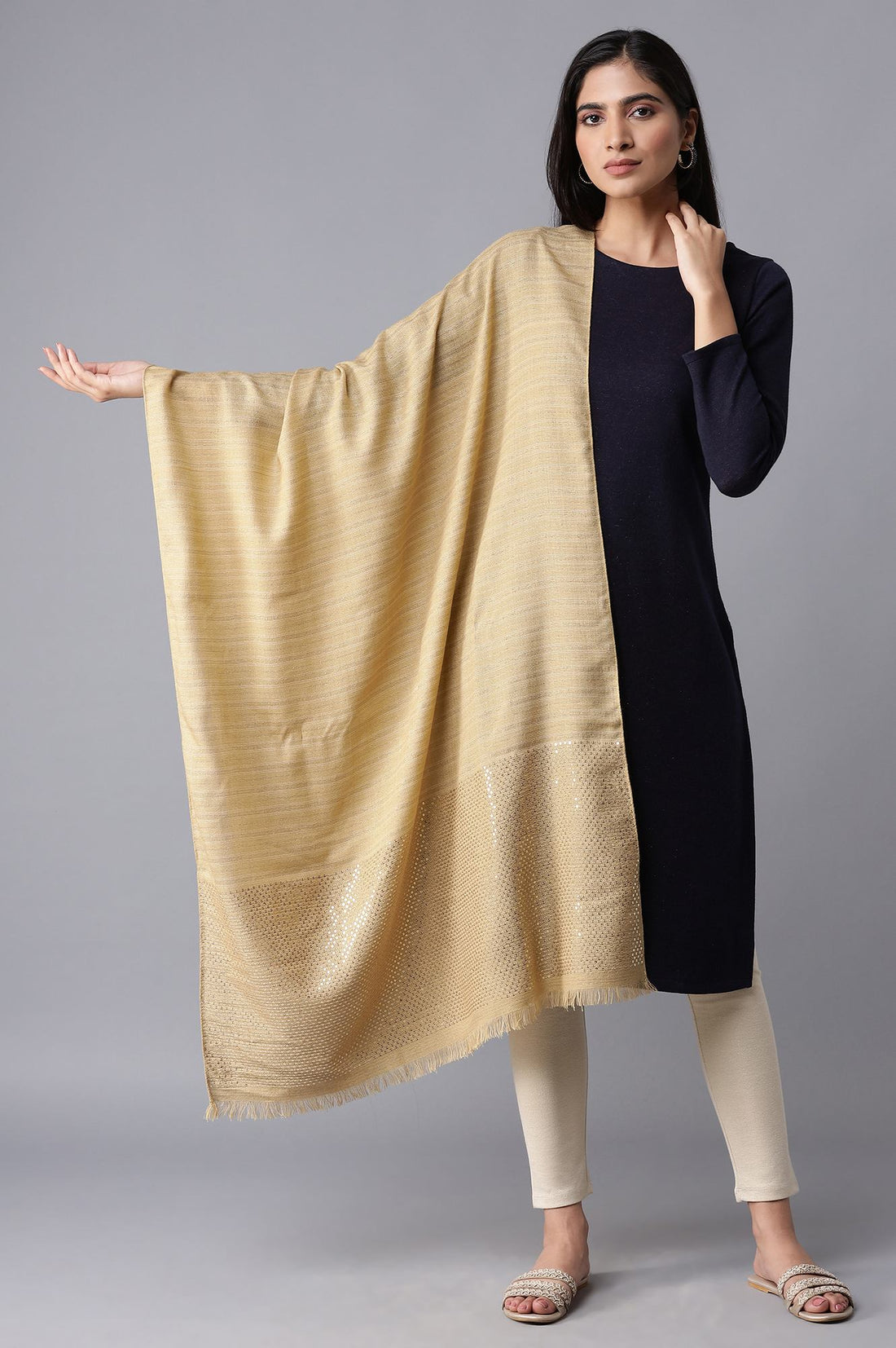 Stay cozy and stylish this winter with this ecru stripe print shawl crafted in acrowool lurex.