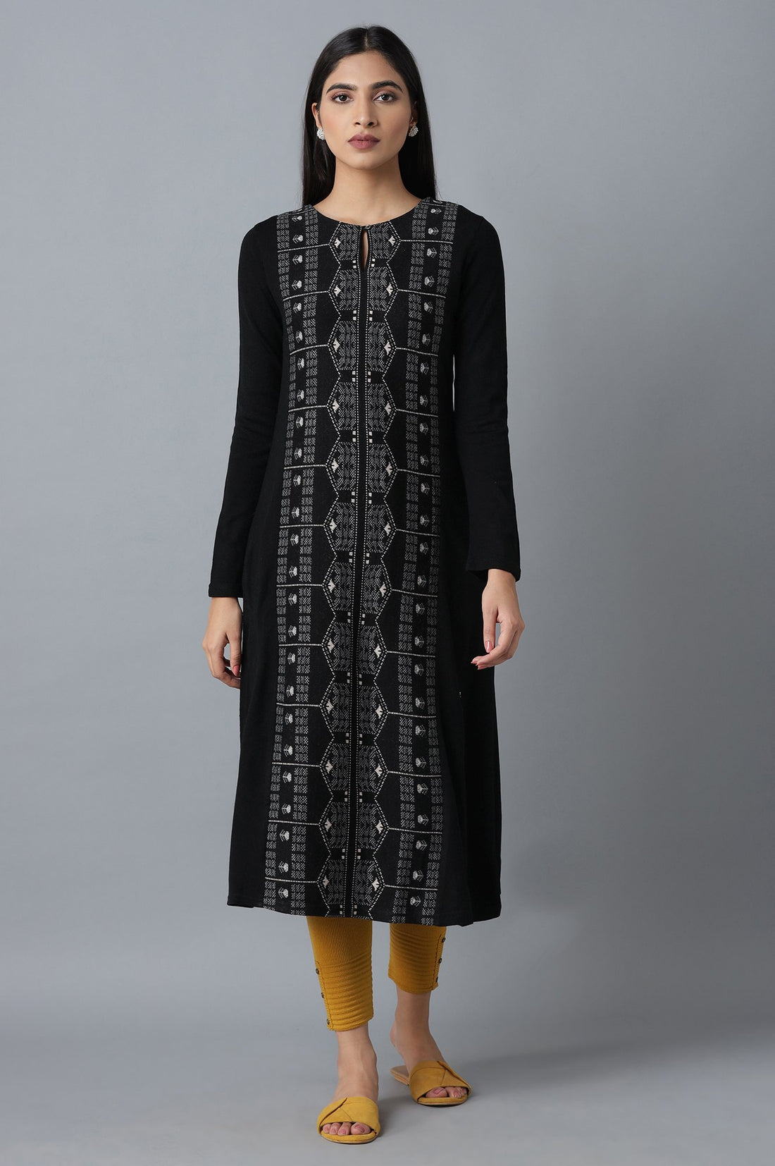 Classy yet elegant! Pick this Aline black acrylic jacquard kurta having panelled body detail and keyhole neckline. This Woollen kurta also features geometric print and two side pockets.