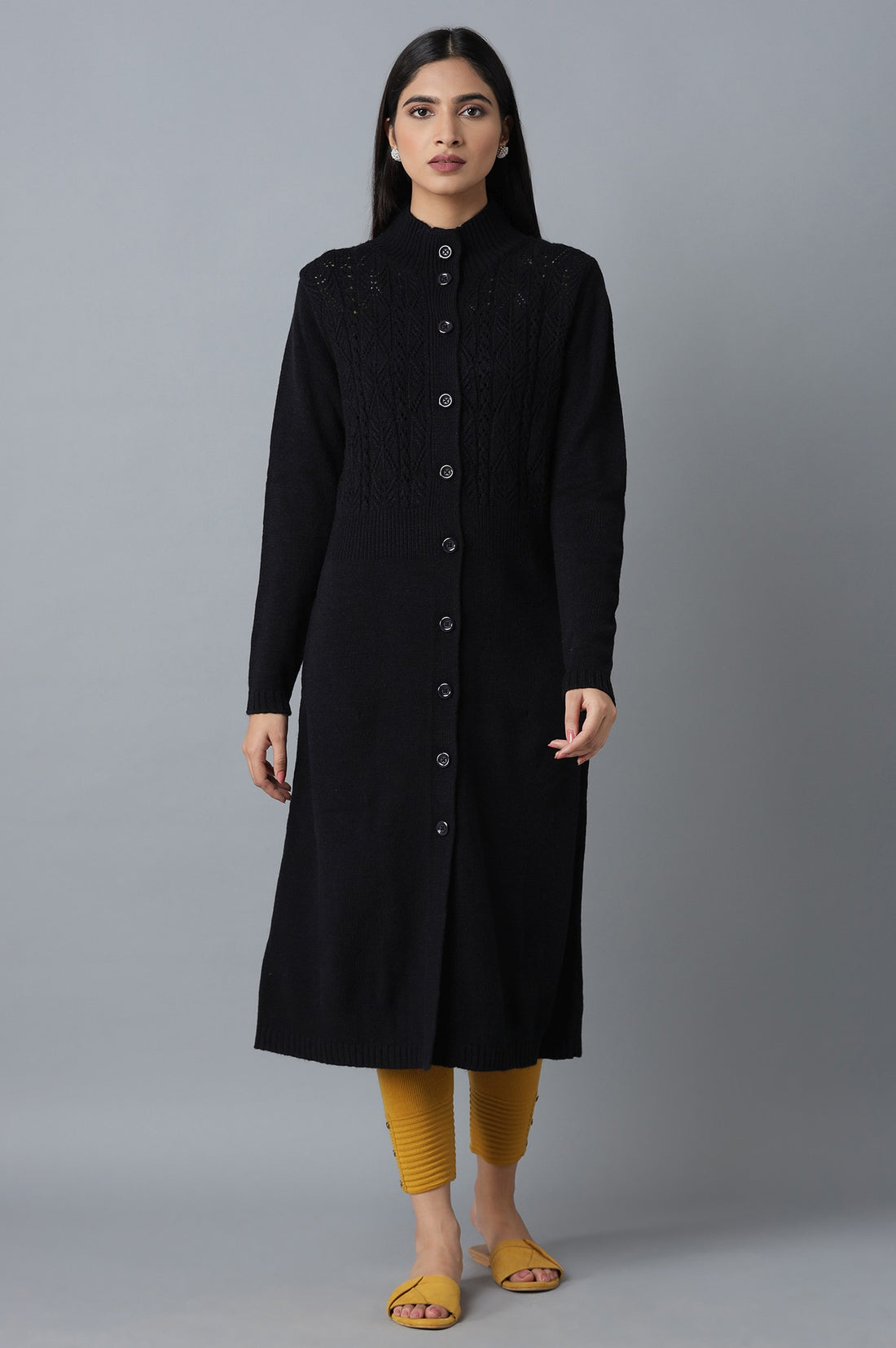 For a stylish look this winter you can team up your top wear with this warm black acrowool jacket. The staright knitted jacket has raised neck and button closure.