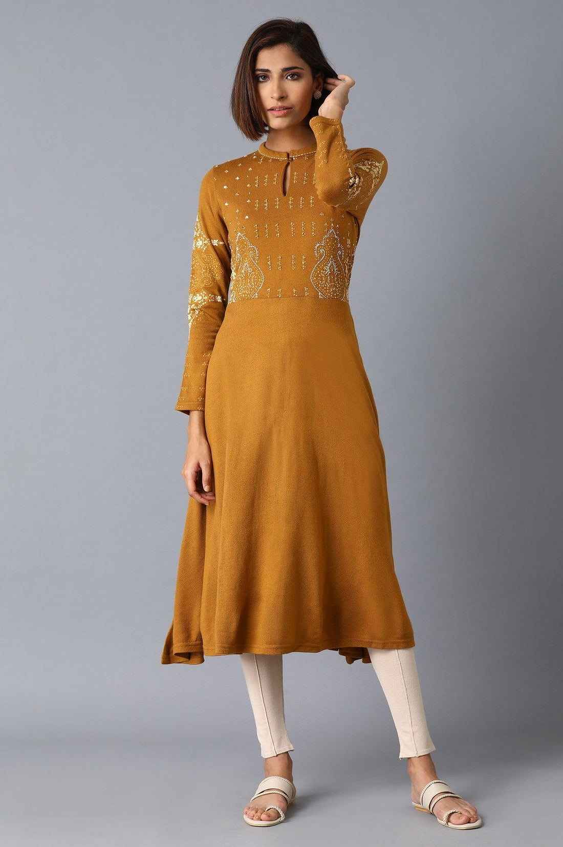 Pair this pumpkin seed-coloured kurta with white solid winter tights and flats for the gorgeous look.