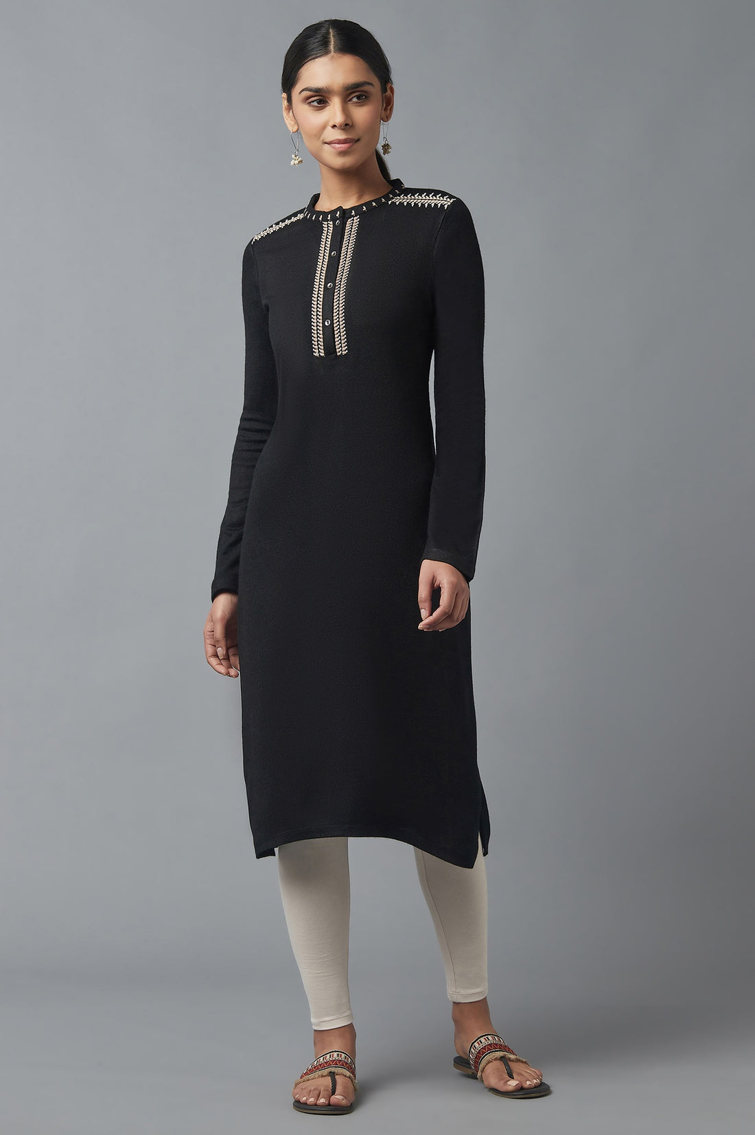 Pep Up Your Ethnic Winter Wear Collection With This Statement Jet Black Embroidered Kurta. Crafted In Soft Acrylic, This Kurta Will Give You A Cozy Cuddle And Stylish Look. Flattering Mandarin Collar With Button Closure And Straight Silhouette For An Elegant Touch.