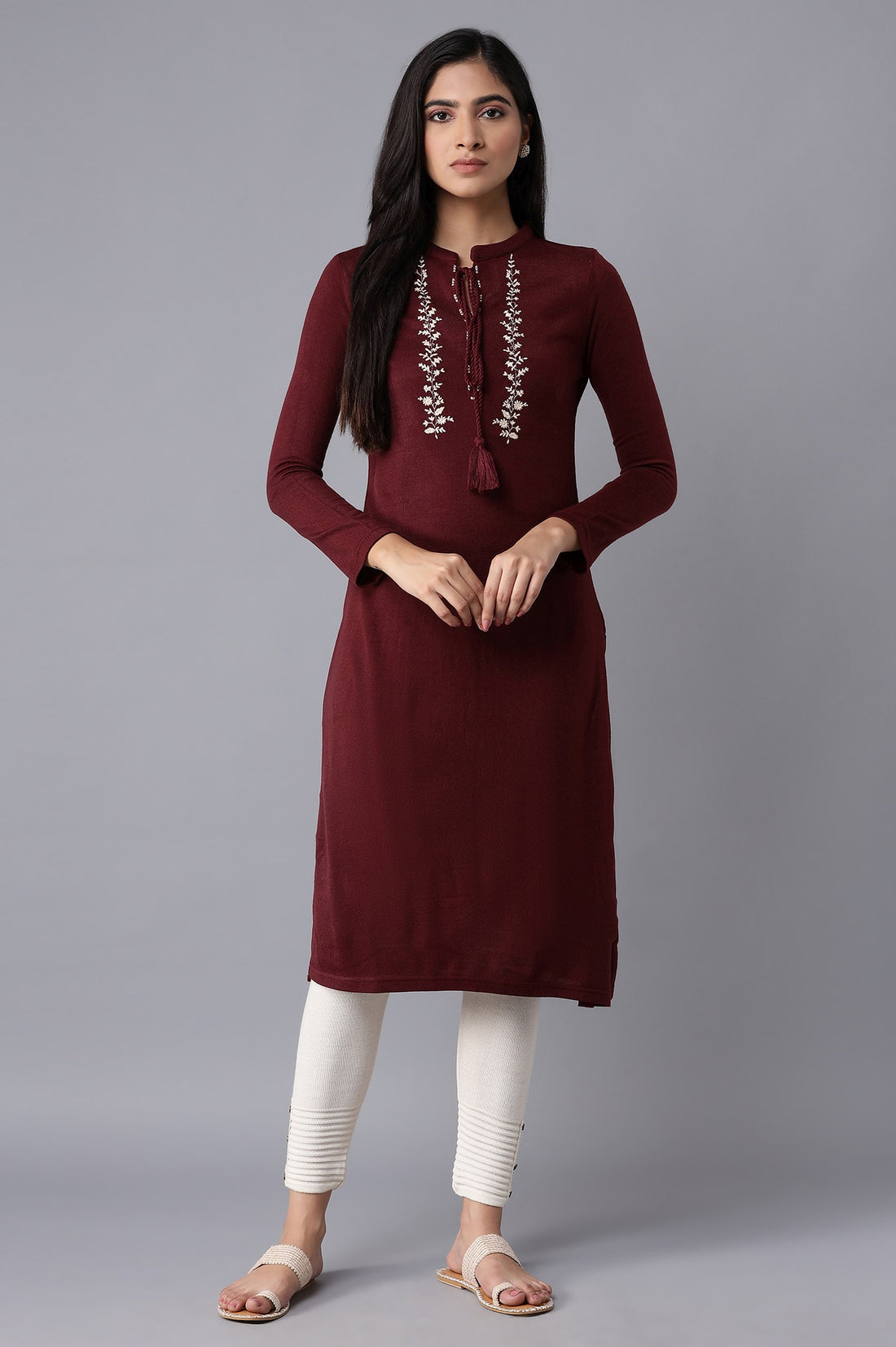 Shine this winter by wearing this charming winter kurta embellished with thread embroidery and dori tie-up on yoke. It also features mandarin collar and full sleeves.
