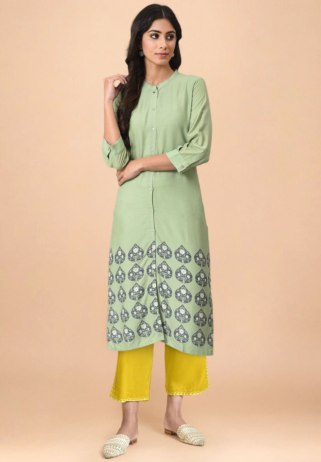 Echoing fresh spring vibes, this light green straight kurta and slim pant set is made from lightweight rayon. Floral prints and intricate lace trim give it an elegant touch, while the slim pants add structure. This kurta set for women is perfect for day events, coffee catch-ups, or seasonal celebrations, offering both style and ease.