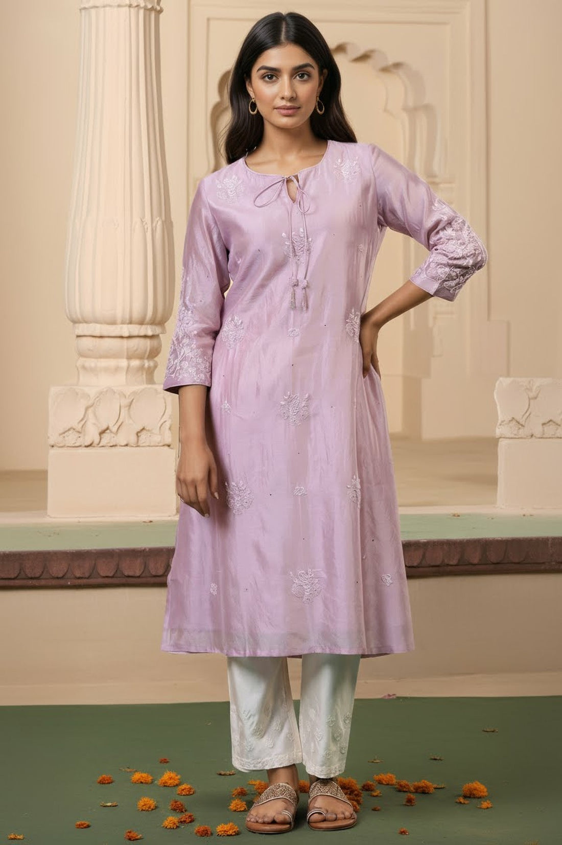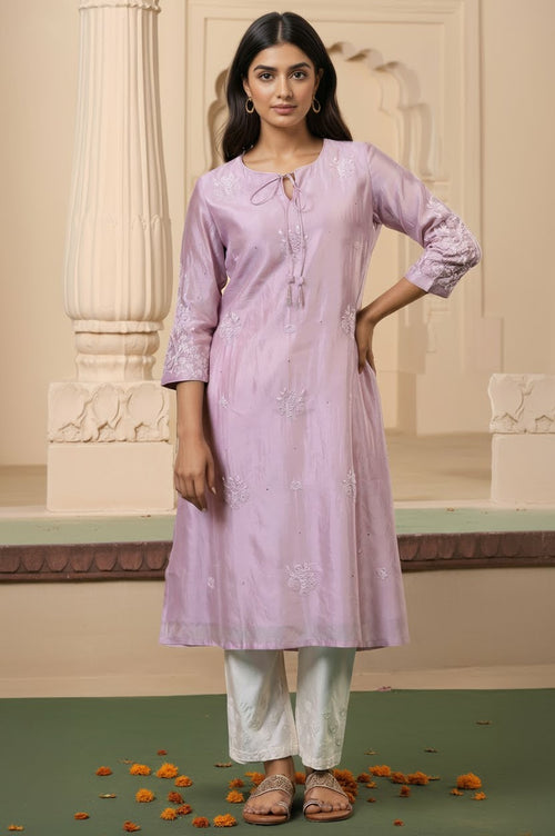 Embrace elegance with this lilac kurta from Folksong. Crafted from a luxurious blend of 82% cotton and 18% silk, this A-line kurta features exquisite Chikankari embroidery. The three-quarter sleeves and tie-up neckline add a touch of sophistication to this women's garment. Perfect for elevated occasions, this regular-fit kurta combines traditional craftsmanship with contemporary style. The cotton-silk blend fabric offers a soft feel and subtle sheen, ensuring comfort and elegance. The delicate Chikankari work showcases intricate artistry, making this kurta a true statement piece. Whether paired with palazzo pants or a skirt, this versatile kurta is sure to make you stand out at any event.