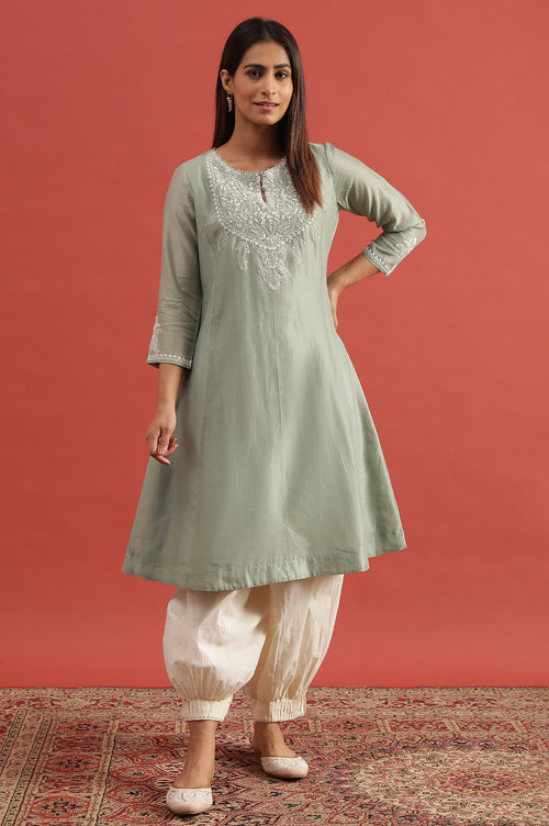 A Flared Kurta Crafted In Cotton Silk, Features Elaborate Chikankari Embroidery At Yoke And Buti On Sleeves. Includes Attached Lining.