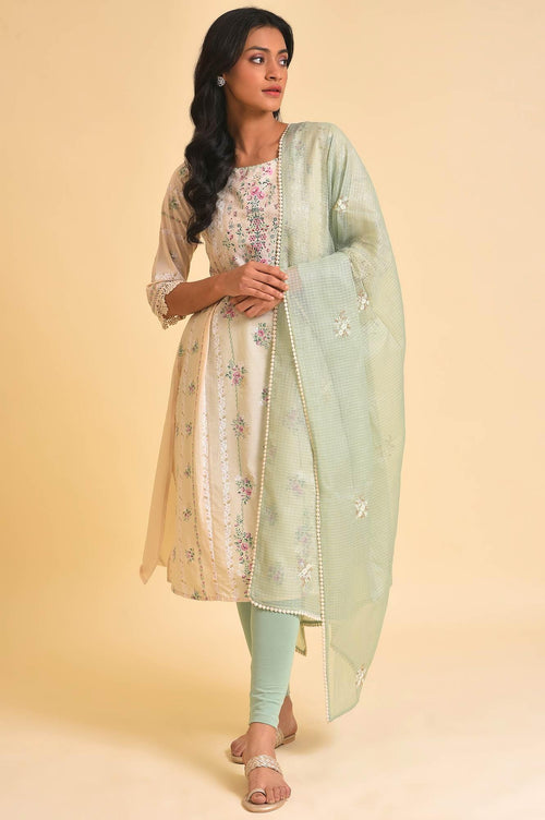 Get An Elegant Yet Stylish Look In This Pretty Seashell Beige Cotton kurta. This Summer kurta Has Round Neckline And Front Pleats. Its Sleeves Has Lace Details.