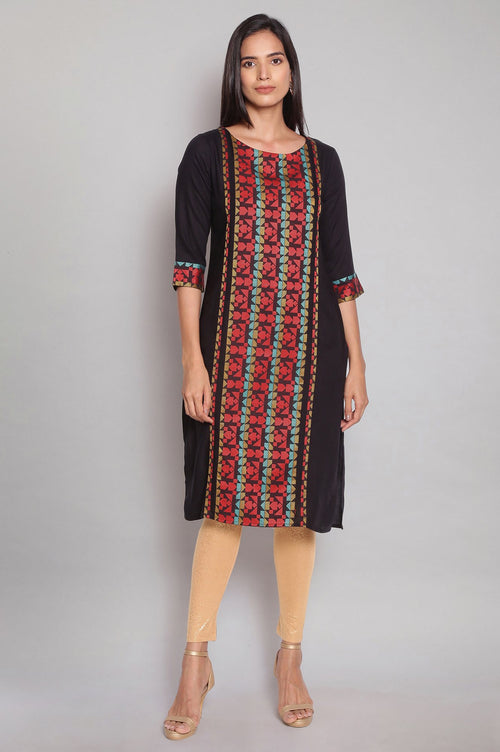 Amp Up Your Casual Wardrobe With This Yarn-Dyed Black Solid kurta In Round Neck. Designed In Straight Silhouette The kurta Has Three-Quarter Sleeves And Gives Regular Fit.