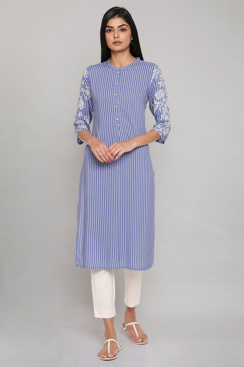 Blue yarn dued stripe print kurta in round neck and three-quarter sleeves.
