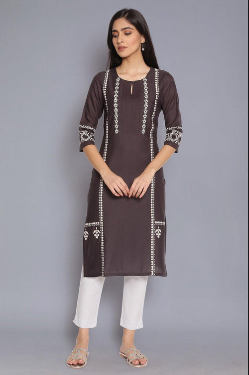 Elevate your casual wardrobe with this stunning brown kurta, perfect for those laid-back occasions. Crafted with a straight silhouette, this ethnic piece features a charming keyhole neckline that adds a touch of elegance. The three-quarter sleeves provide a comfortable fit, ideal for various weather conditions. What sets this kurta apart is its exquisite floral print, adding a delightful visual appeal to the overall design. Constructed using a woven technique, this garment ensures durability and a pleasant texture. Made from 100% viscose, also known as rayon, it offers a soft, breathable feel against your skin, making it perfect for all-day wear. The use of viscose also lends a beautiful drape to the kurta, enhancing its overall silhouette. This versatile piece effortlessly combines style and comfort, making it a must-have addition to your ethnic wear collection.