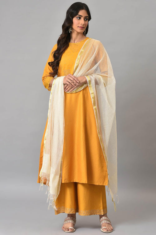 Burnt Mustard Printed A-Line kurta With Embroidery And Sequin Highlighting On The Yoke