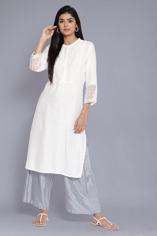Embrace ethnic elegance with this stunning white kurta, crafted from a luxurious blend of 88% rayon and 12% flax. The three-quarter sleeves offer a perfect balance between comfort and style, making it an ideal choice for casual occasions. The woven construction technique ensures durability and a beautiful drape. This straight-cut kurta features exquisite embroidery, adding a touch of sophistication to its design. The band neckline provides a sleek and modern look, while the flax component in the fabric enhances breathability and texture. Whether you're attending a family gathering or a casual outing with friends, this kurta effortlessly combines traditional charm with contemporary flair.