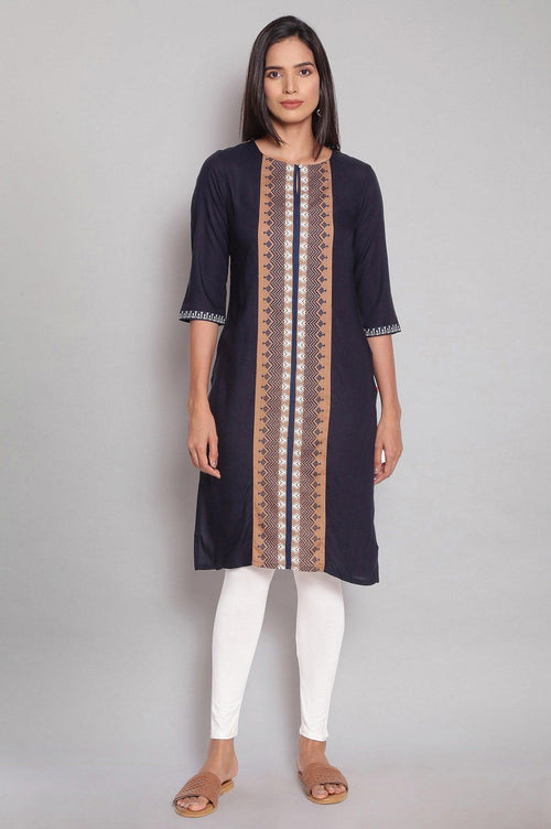 Discover the perfect blend of comfort and style with this captivating blue kurta, designed for the fashion-forward individual seeking ethnic charm. This straight-cut kurta features a classic round neckline and three-quarter sleeves, offering a timeless silhouette that suits various occasions. Crafted using a woven construction technique, it ensures longevity and maintains its shape wear after wear. The 100% viscose composition provides a soft, breathable feel, making it ideal for all-day wear. What truly sets this kurta apart is its eye-catching geometric print, adding a contemporary twist to traditional ethnic wear. The rayon fabric lends a beautiful drape and a subtle sheen, elevating the overall look. Perfect for casual outings, this kurta effortlessly combines comfort with style. Its versatile design allows for easy pairing with a variety of bottoms, from classic churidars to modern palazzo pants. Whether you're attending a family gathering or a casual day out with friends, this blue kurta is sure to make a lasting impression with its unique blend of traditional aesthetics and modern design elements.