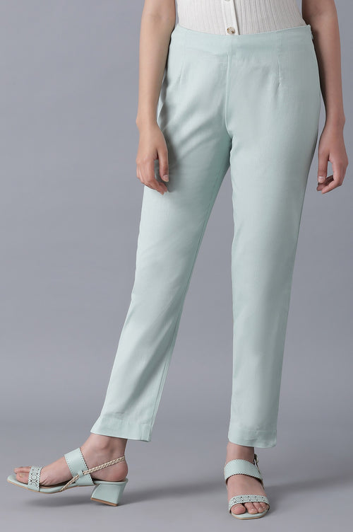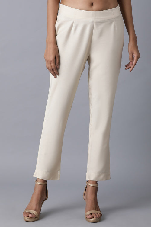 Beige ankle length trousers with elasticated back and zipper closure on one side.