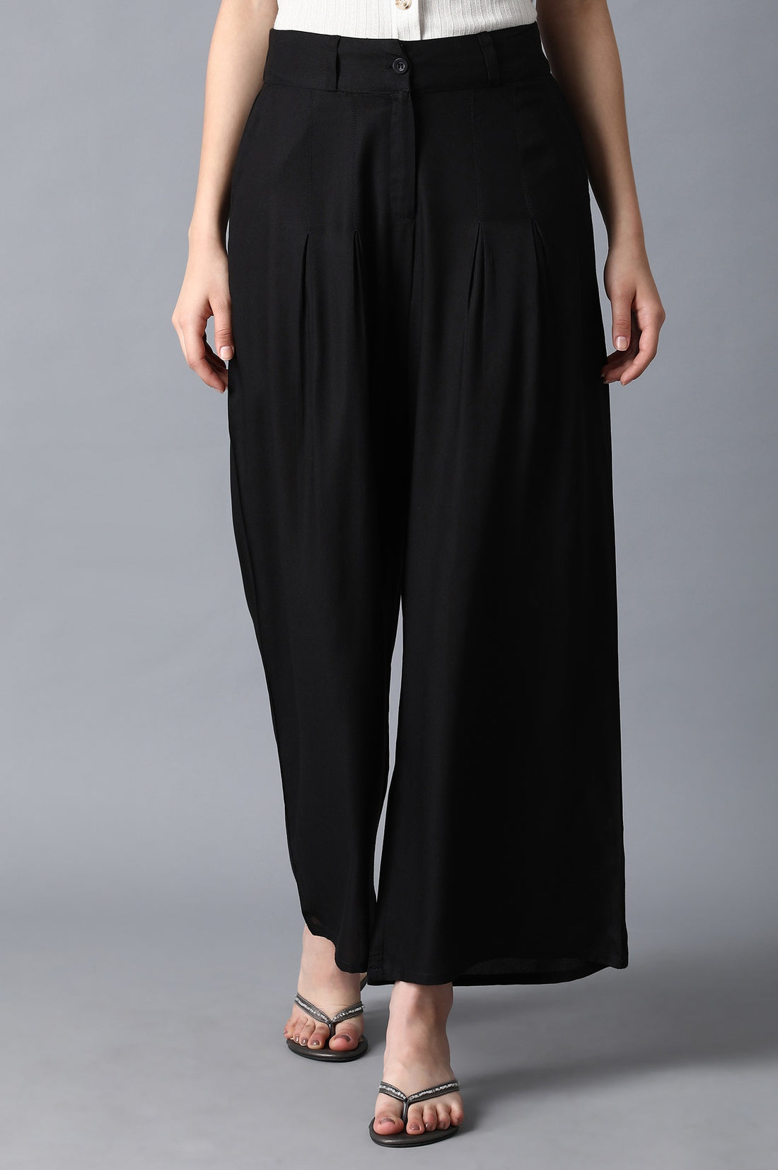 Black tailored volume flared pants with pleated detail, pockets and button closure.