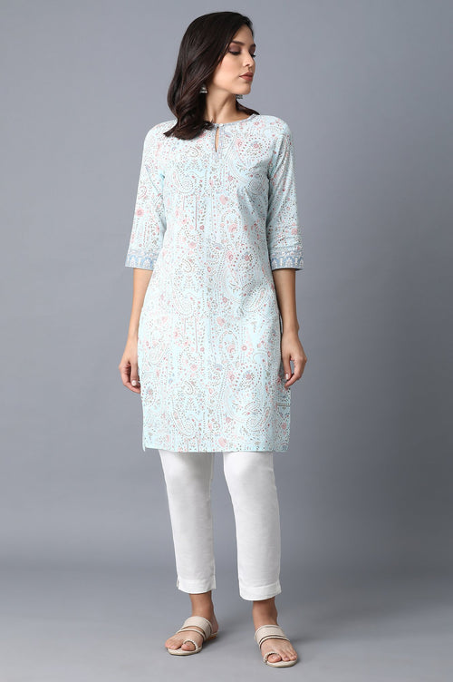 Light blue printed kurta with key hole neck and boarder on sleeves.