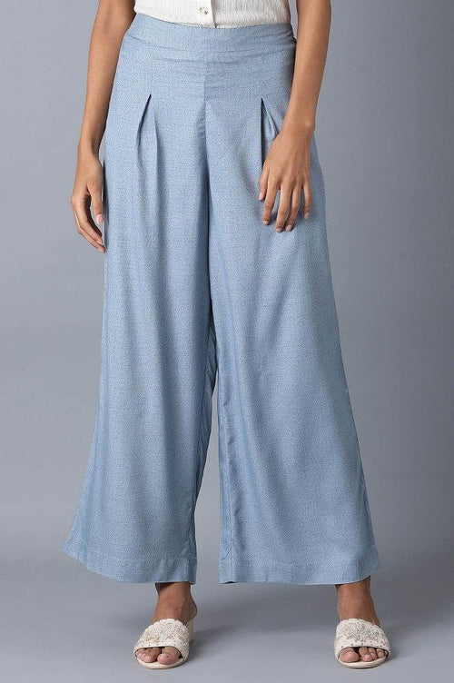 Denim blue printed parallel pants with pleat details at front in mid rise and partially elasticated waistband.