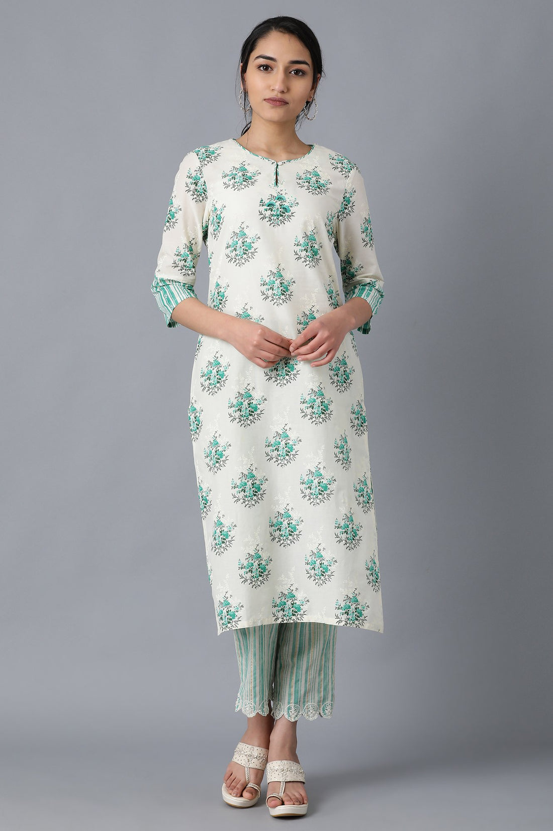 Discover the perfect blend of comfort and style with this ethnic kurta designed for women. The keyhole neckline adds a touch of elegance, while the three-quarter sleeves offer practicality and comfort. Crafted from 100% pure cotton, this kurta ensures breathability and softness against the skin. The woven construction technique enhances the durability of the garment. The pristine white color serves as a beautiful canvas for the delicate floral print, adding a feminine and fresh appeal. The straight silhouette flatters various body types and allows for ease of movement. Ideal for casual outings, this kurta combines traditional ethnic elements with contemporary design, making it a versatile addition to your wardrobe.