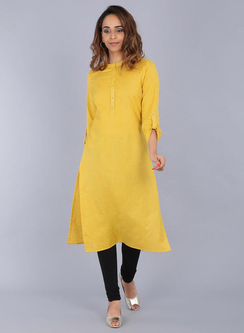 This orange mandarin neck 3/4 sleeve kurta has solid pattern and side slits.