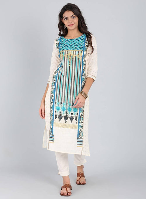 This white and blue round neck 3/4 sleeve kurta has printed detail along with golden detailing over the print.