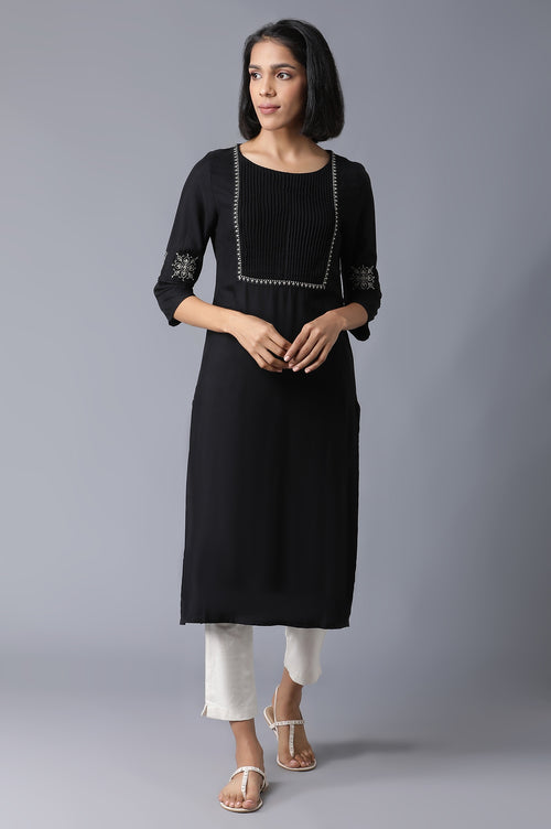 Indulge in the allure of this stunning straight kurta designed for elevated occasions. Crafted from 100% viscose, this woven masterpiece offers a luxurious feel and elegant drape. The rich purple hue adds a regal touch to your ethnic ensemble. Adorned with intricate embroidery, this kurta showcases exquisite craftsmanship and attention to detail. The round neckline provides a classic and versatile look, suitable for various face shapes. The three-quarter sleeves offer a perfect balance between comfort and style, making it ideal for both daytime and evening events. The straight silhouette creates a sleek and modern appearance, flattering a range of body types. Made from rayon, this kurta ensures breathability and comfort throughout your wear. The embroidered details add depth and texture to the garment, elevating its overall aesthetic appeal. Whether paired with traditional bottoms or styled with contemporary accessories, this purple kurta is sure to make you stand out at any ethnic gathering or special occasion.