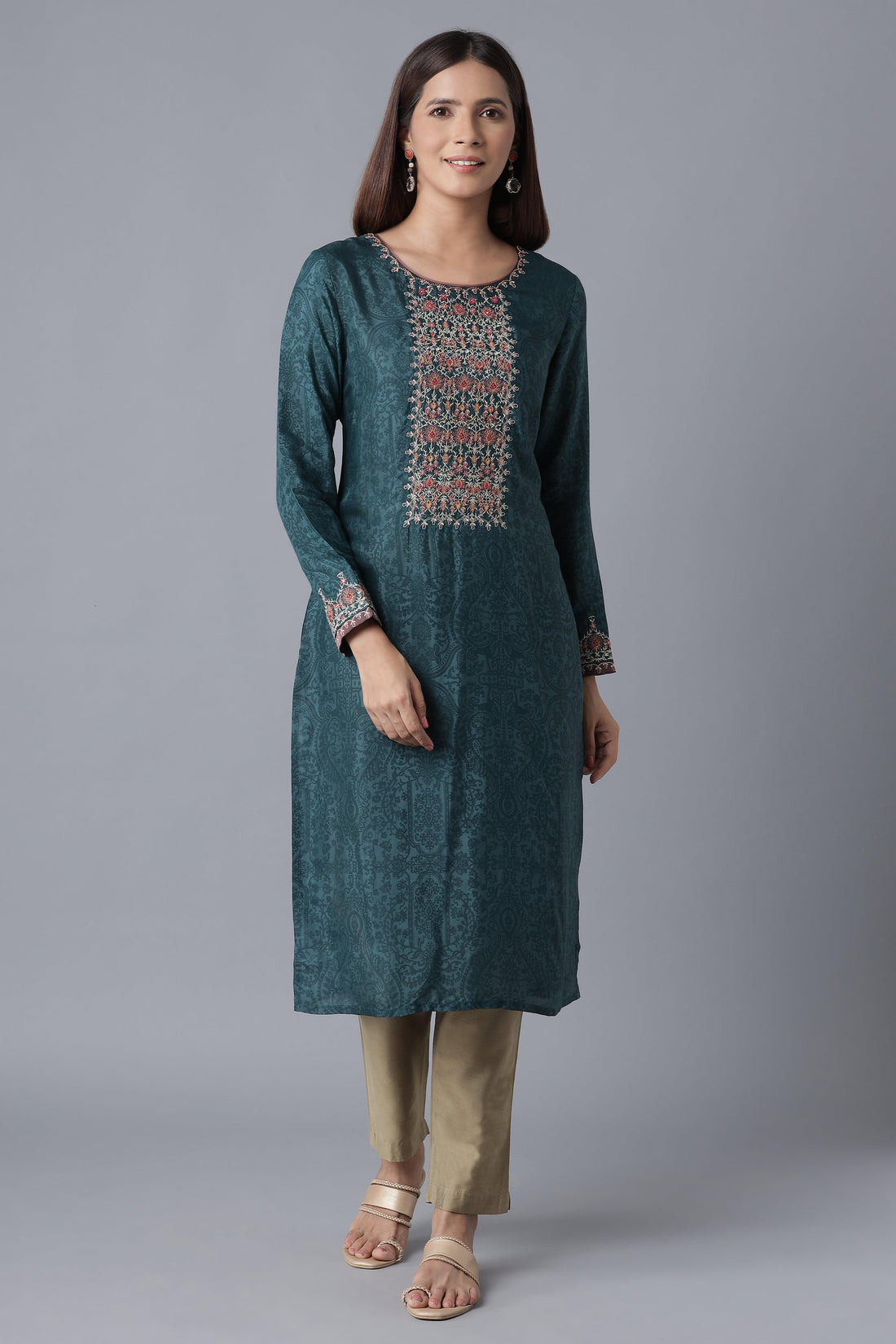 A chic ensemble designed to make you look gorgeous this festive season. Teal straight kurta featuring contemporary floral embroidery on the yoke, sequin embellished round neckline and full sleeves.