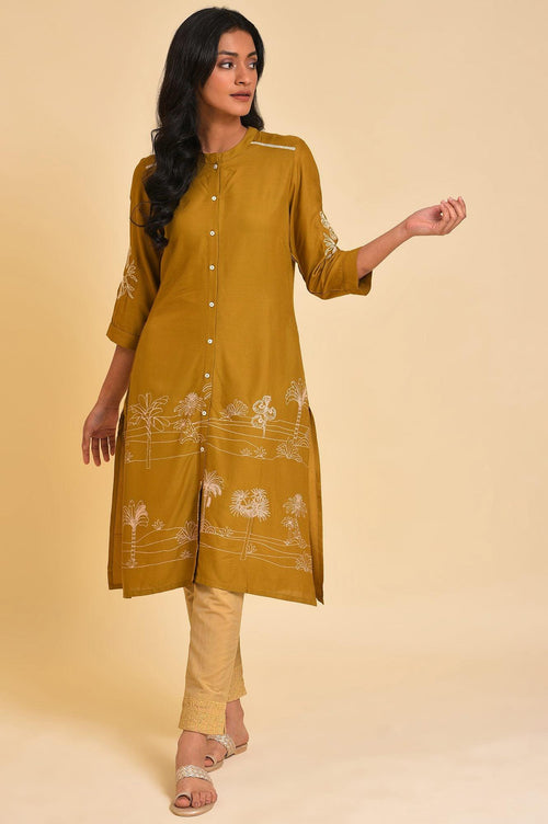 Elevate your casual wardrobe with this exquisite yellow kurta, perfect for those who appreciate ethnic charm. Crafted with meticulous attention to detail, this woven piece features intricate embroidery that adds a touch of elegance to its design. The three-quarter sleeve length offers a comfortable and versatile fit, suitable for various occasions. Made from 100% viscose rayon, this kurta ensures breathability and a soft feel against your skin. The straight silhouette flatters various body types, while the band neckline adds a subtle sophistication. Whether you're attending a family gathering or a casual outing with friends, this kurta is sure to make you stand out with its vibrant yellow hue and impeccable craftsmanship.