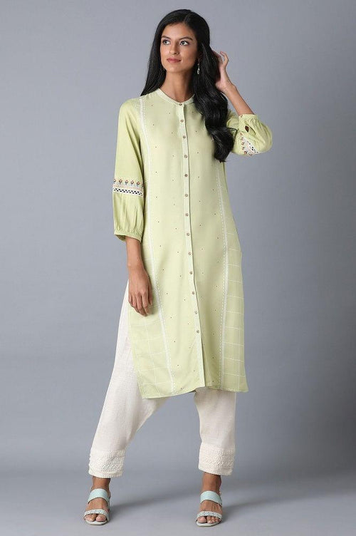 Elevate your casual wardrobe with this exquisite green kurta, perfect for those who appreciate ethnic charm. Crafted from 100% viscose, this woven garment offers both comfort and style. The band neckline adds a touch of sophistication, while the three-quarter sleeves provide a versatile look suitable for various occasions. The straight silhouette flatters most body types, making it a versatile addition to your wardrobe. What sets this kurta apart is its beautiful embroidery, adding a delicate and intricate touch to the overall design. The viscose fabric ensures breathability and a soft feel against the skin, making it ideal for all-day wear. Whether you're attending a casual gathering or running errands, this green kurta will keep you looking effortlessly stylish and feeling comfortable throughout the day.
