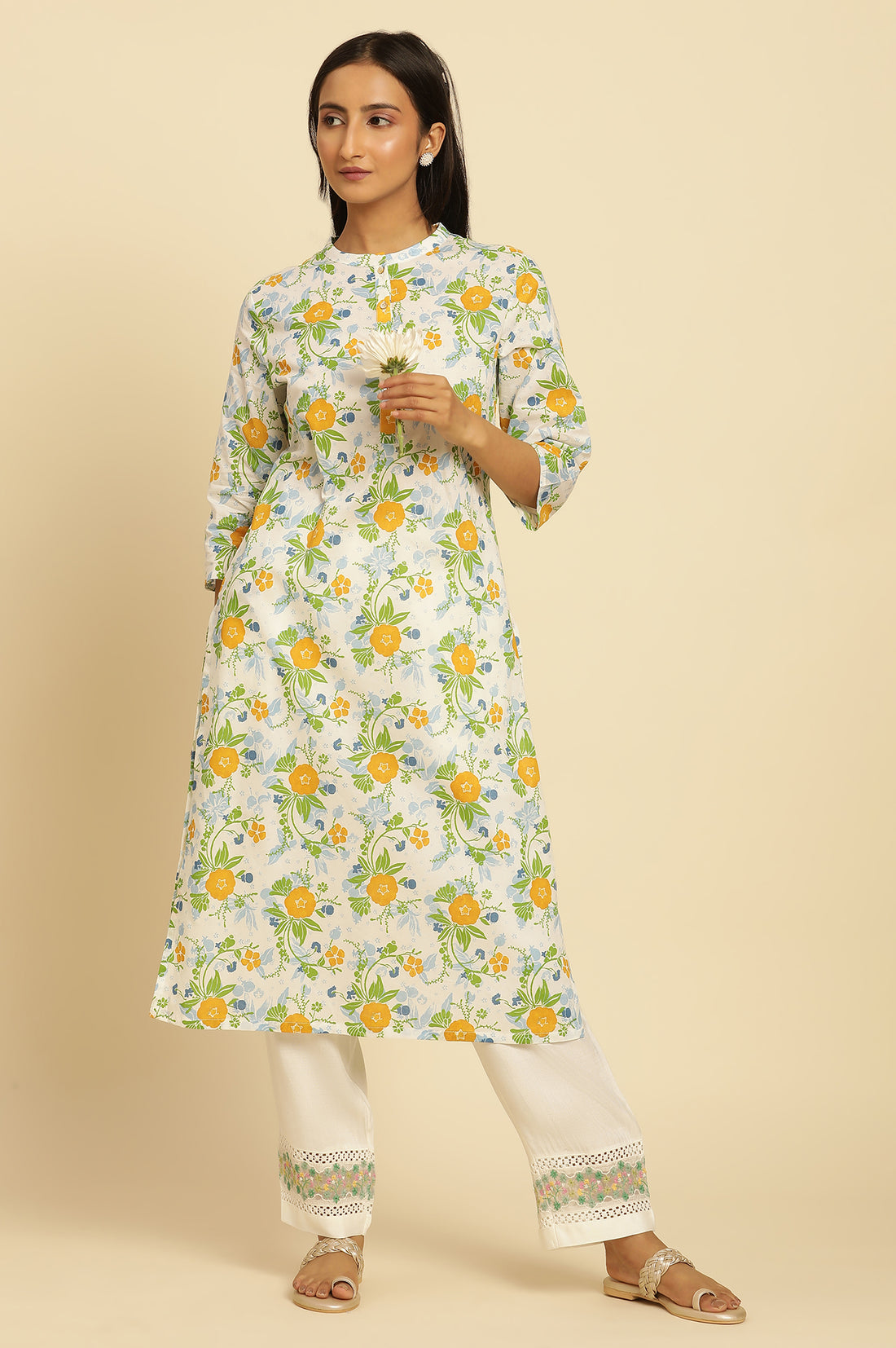 Discover the perfect blend of comfort and style with this exquisite women's kurta. Crafted from 100% pure cotton, this woven garment offers breathability and softness for all-day wear. The ethnic-inspired design features a beautiful floral print, adding a touch of elegance to your casual wardrobe. The straight cut silhouette flatters various body types, while the band neckline adds a subtle sophistication. The three-quarter sleeves provide versatility for different seasons. This white kurta is a versatile piece that can be dressed up or down for various casual occasions. The attention to detail in its construction ensures durability and a polished look. Embrace the charm of traditional Indian fashion with this comfortable and stylish kurta that seamlessly blends ethnic elements with contemporary design.