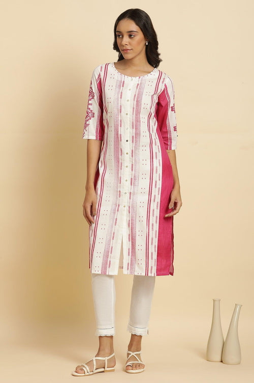 Discover effortless style with this women's kurta, a perfect blend of comfort and fashion. Made from 100% pure cotton, this woven garment ensures breathability and softness against your skin. The off-white kurta boasts an attractive striped pattern, adding a touch of sophistication to your look. Featuring three-quarter sleeves and a round neckline, it offers a timeless appeal. The straight cut silhouette provides a sleek and flattering fit for all body types. Ideal for casual wear, this ethnic kurta is versatile enough for various occasions. Embrace the simplicity and elegance of this cotton kurta, a must-have addition to your wardrobe. Pair it with stylish sandals to complete the look, exuding effortless elegance. Versatile and timeless, this outfit is perfect for making a statement at any occasion, day or night.