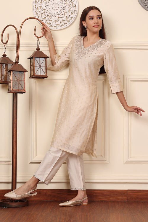 Elevate your ethnic wardrobe with this stunning cream-colored kurta set designed for women who appreciate elegance and comfort. This special occasion ensemble features a beautifully embroidered kurta with a flattering v-neck and practical three-quarter sleeves. The straight cut of the kurta ensures a sleek silhouette, while the woven construction technique guarantees durability. Crafted from a luxurious blend of 80% viscose and 20% polyester, this set offers the perfect balance of comfort and style. The viscose fabric provides a soft, silky feel against the skin, while the polyester adds strength and wrinkle resistance. Perfect for weddings, festivals, or any special event, this ethnic set will make you stand out with its exquisite craftsmanship and timeless appeal.