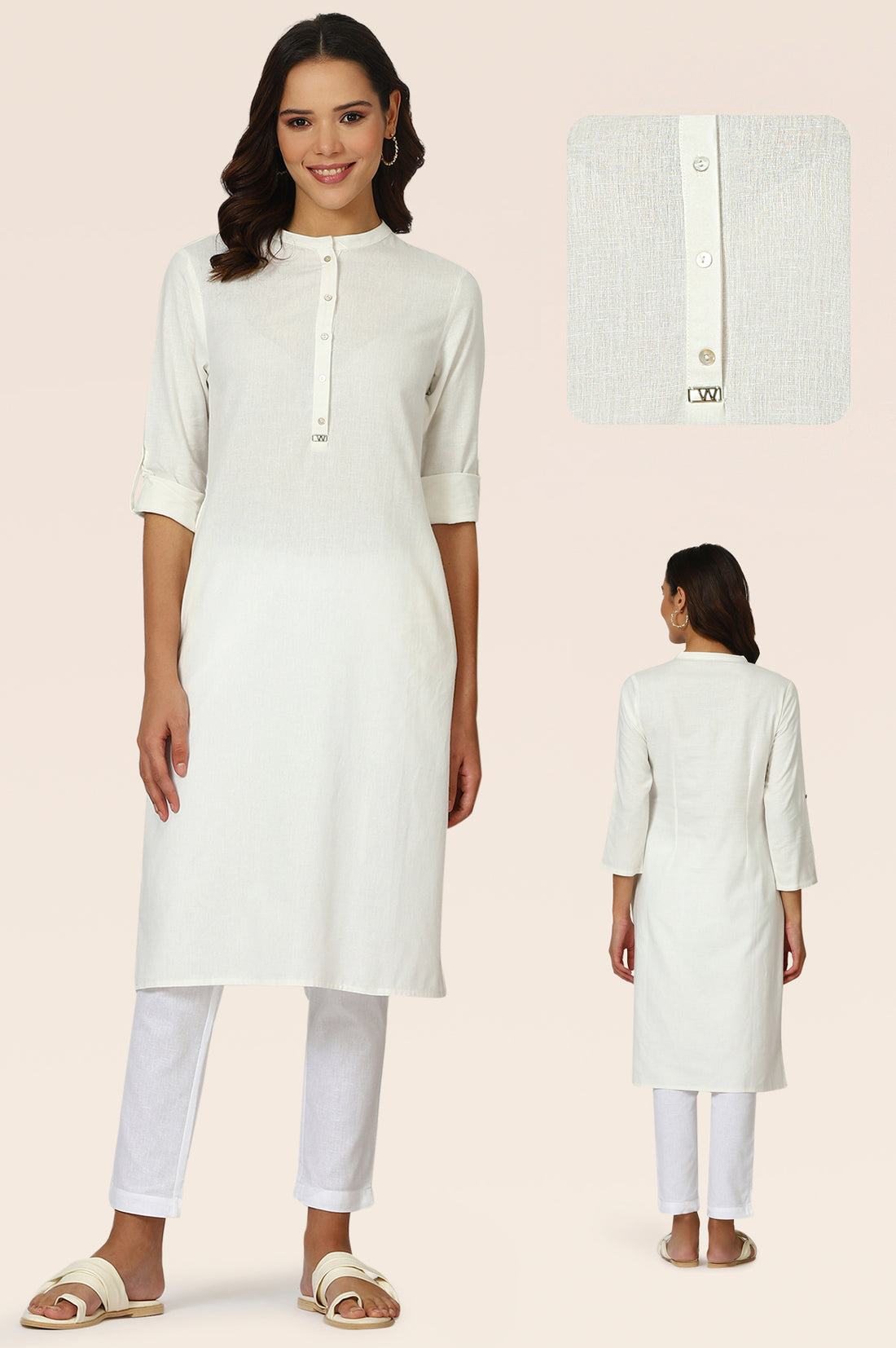 Amp up your casual or office look with our cotton flax straight kurta. The kurta is designed in straight silhouette and has half button placket. It comes with rolled up sleeves and mandarin collar. Made from breathable and comfortable cotton flax fabric, it adds elegant yet stylish touch to your wardrobe.