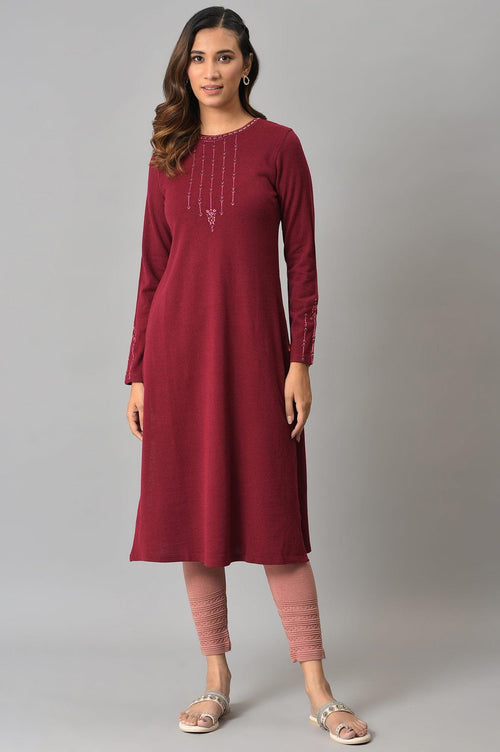 Garnet Straight Winter kurta With Colourful Embroidery At Neck And Cuff. This Winter kurta Has Round Neck And Designed In Straight Silhouette.