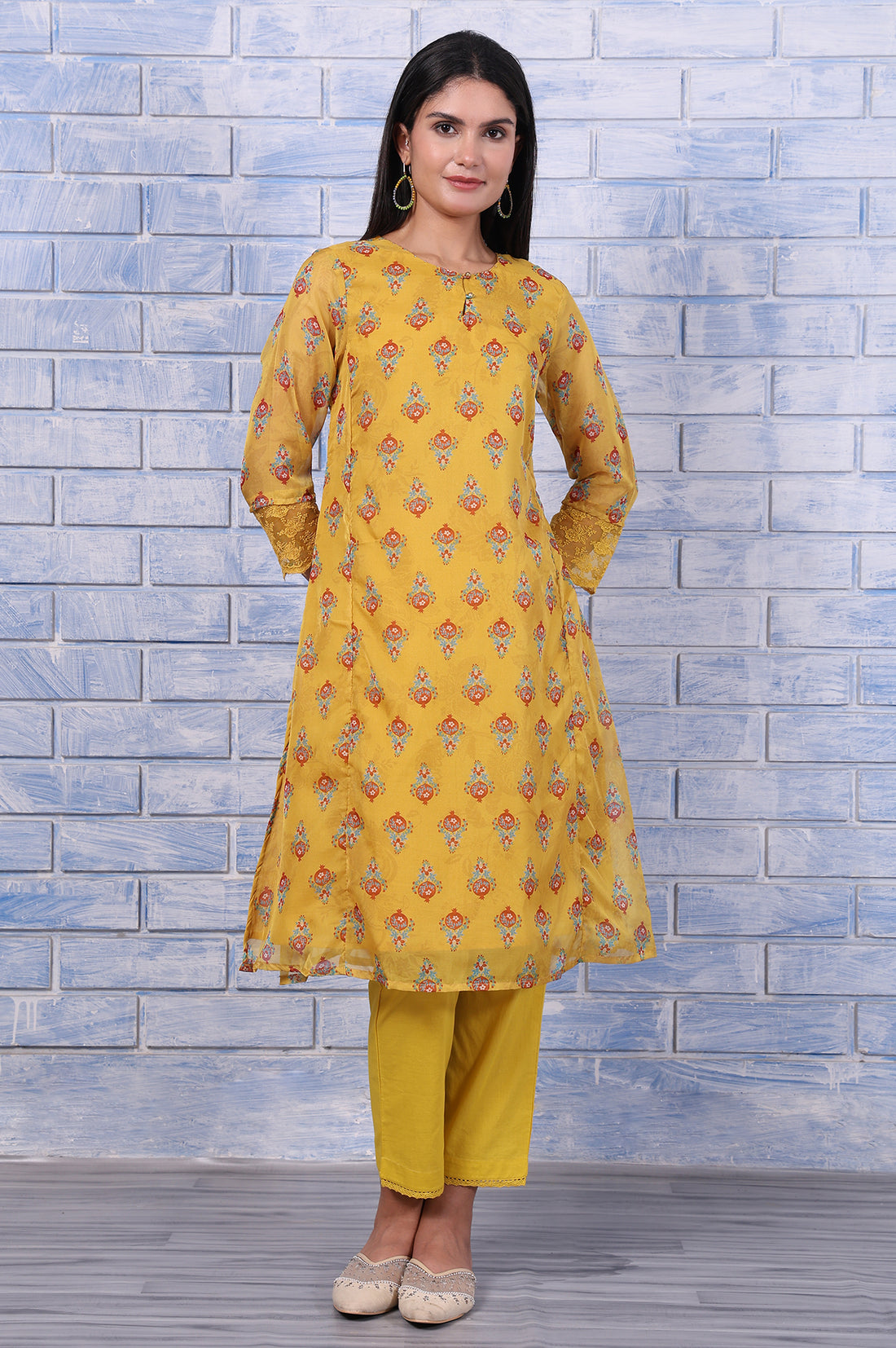 This straight kurta in vibrant yellow captures a light, summery mood with its floral printed organza silhouette. The semi-sheer fabric flows elegantly, while the structured design maintains a clean profile. Ideal for brunches or festive gatherings, the translucent quality of organza allows for a breezy finish that stays elevated. The floral motifs soften the tone and introduce a romantic flair, while the straight cut ensures it flatters most body types. Whether you’re aiming for casual elegance or a festive ethnicwear outfit, this piece strikes the perfect balance.