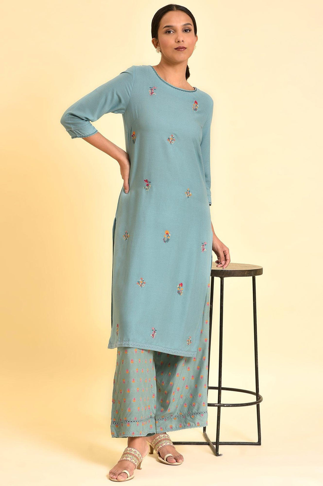 Boost Your Regal Charm With This Aqua Blue Floral Printed Kurta. Crafted In Premium Rayon Fabric, This Beautiful Kurta Will Turn Heads Wherever You Go. With Graceful Designing, It Features Thread Embroidery Which Makes It An Attractive Piece. It Is Paired With Printed Parallel Pants.