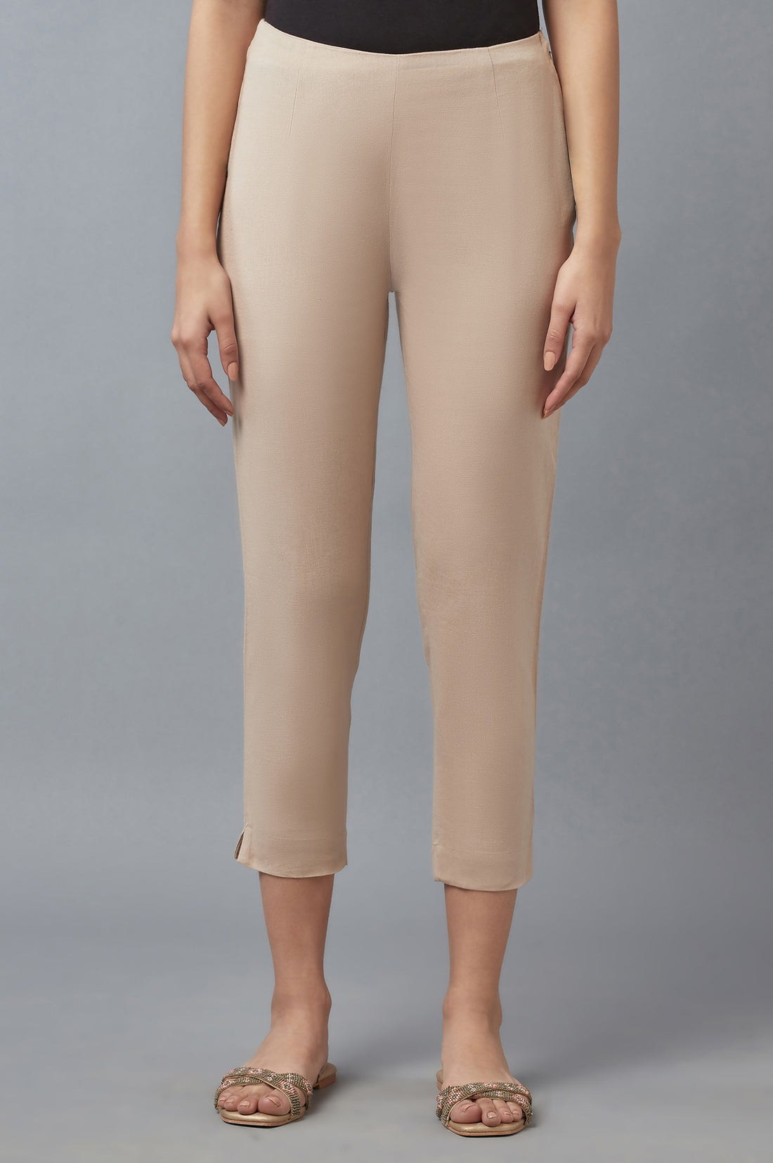 This beige-coloured ankle-length trouser has an elasticated back with button and zip closure on one side.