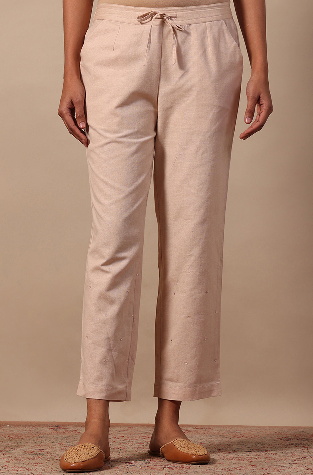 A timeless solid straight pants in beige hue in cotton flax featuring mirror work detail. It is designed with a drawstring, partially elasticated waist band, and side pockets for essentials.