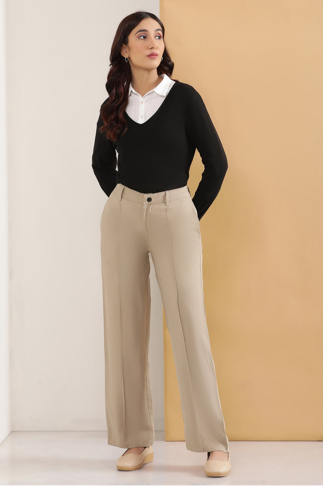 Crafted for the modern professional, these beige pintuck parallel pants redefine sophistication. The premium woven rayon twill fabric offers a luxurious soft hand feel, ensuring comfort throughout the day. The straight-fit silhouette with pintuck detailing creates a polished look, perfect for formal settings or casual outings. Functional front and back pockets provide practicality, while the slightly elasticized waistband ensures a tailored fit. Belt loops add versatility, allowing you to accessorize with your favorite belt. Pair these pants with a crisp shirt or a chic top to complete your ensemble.